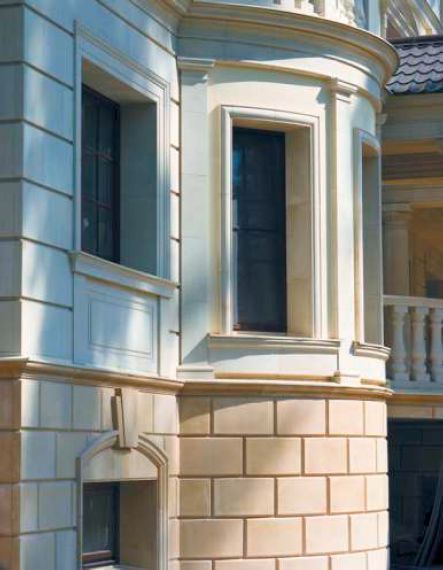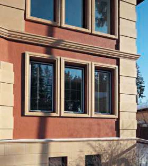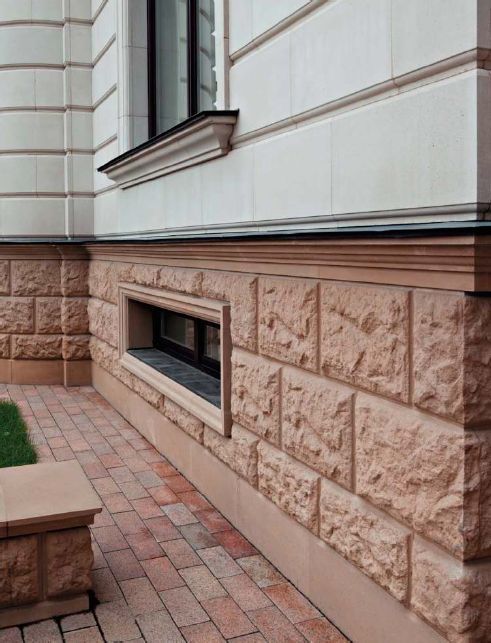 Отделка из искусственного камня прослужит долгое время и не потребует ремонта. Нагрузка на фундамент будет минимальной. Плитка защитит ваш цоколь и будет гармонично смотреться с отливами из любых компонентов.